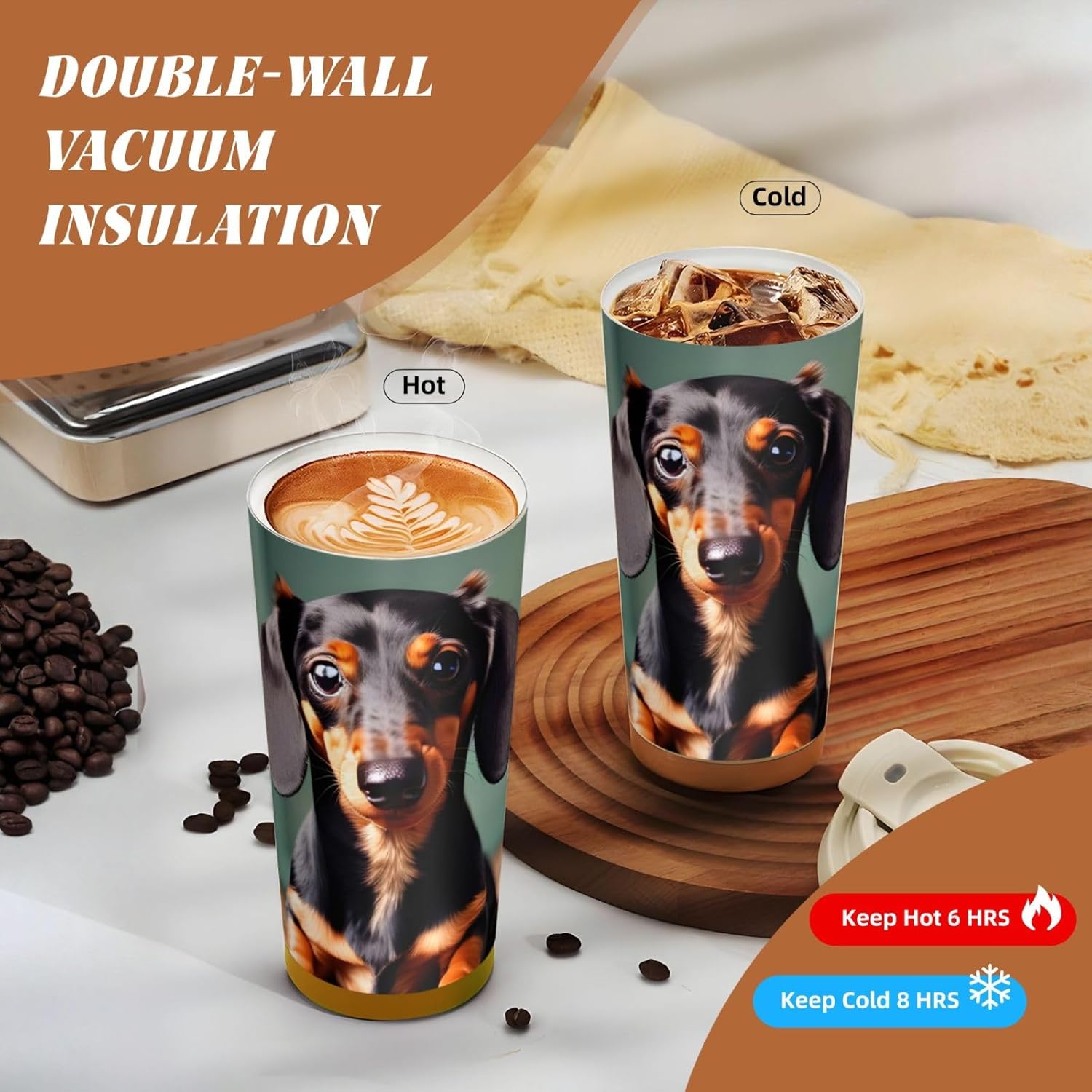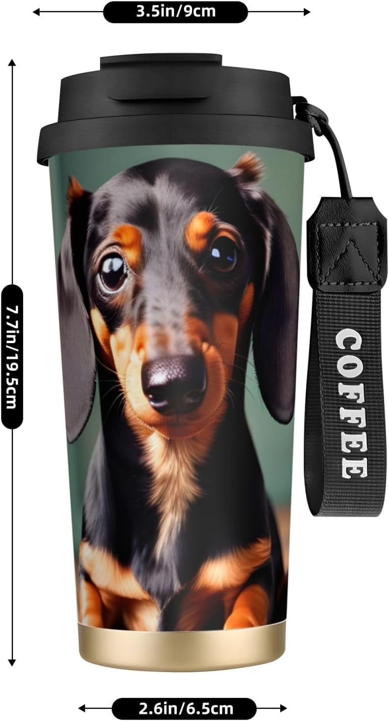 This Cute Dachshund Duggee Print travel Coffee Mug supports three drinking modes: the direct drink spout for quick drinks during commutes, the straw port for iced coffee and other spill prone beverages, and the open top design that replicates the traditional coffee cup experience. BPA Free 316 Stainless Steel, Safe and Durable Inner liner made of food grade 316 stainless steel, non toxic, odorless, BPA free, safe for long term use.